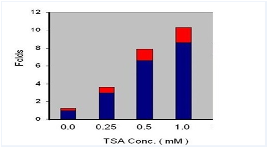 實例1:分析用不同濃度的TSA處理12小時的細胞中的總乙酰化蛋白水平。即先用抗AcK瓊脂糖填料IP,再以ELISA方法用HRP標記的抗乙酰化抗體做檢測不同濃度TSA處理的細胞中,快速檢測出其蛋白質(zhì)乙?;黾舆_10倍。