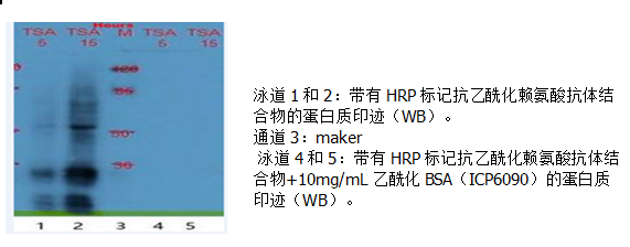 實例2:分別用HDAC抑制劑TSA處理5和15小時后,對MMRU細胞樣品中的乙酰化蛋白質(zhì)進行Western blot分析。即樣品先用抗乙?;嚢彼岘傊怯H和富集(IP),再用WB方法,加入HRP標記的抗乙酰化抗體進行檢測,快速得到高確定性的WB結果。