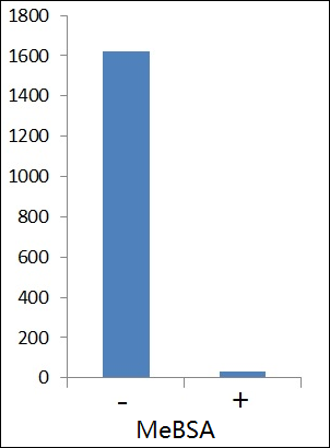 The ELISA titre (1:1620) of the methylated proteins eluted from 50 ul of the methyllysine-specific antibody affinity matrix (ICP0588) as detected with anti-methyllysine HRP (ICP0502). Approximately 50 mg of the swine spleen cell lysate were applied to the enrichment. ELISA signal can be inhibited methylated BSA (MeBSA).