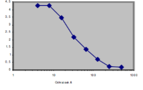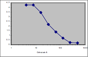 Direct competitive inhibition ELISA using immobilized anti-OA (1.5 μg/mL), and OA-labelled HRP (50 ng/mL). 50% inhibition occurred at 25 ng/mL of free ochratoxin A in non-optimized conditions.