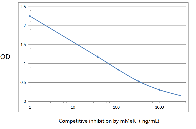 Competitive ELISA: inhibition of the binding mMeR-HRP to anti-mMeR antibody immobilized (1μg/mL) by free mMeR (IC50=40-50 ng/mL)