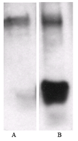 Western blot analysis of the Mono-methylated histone from melanoma cells with anti-mono-Methylated lysine (anti-mMeK, (ICP0401) Histones were isolated with cold 0.1M HCl extraction followed by this method. A: Blot with 0.5 μg/mL of anti-mMeK (ICP0401) in PBSt + methylated BSA (ICP0504) 100 μg/mL B: Blot with 0.5 μg/mL of anti-MeK (ICP0401) in PBSt