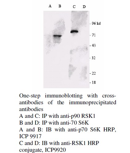ICP9917 Affinity purified rabbit polyclonal P70 S6K antibodies were developed using the c-terminal peptide of human S6K (P70) and conjugated to horse-radish peroxidase (HRP) through reductive amination. This conjugate has been used for one-step immuno-blotting of crude cell lysates and immunoprecipitating P70 S6K. The use of HRP conjugates reduce the time of blotting and background, particularly reducing the interference of IgG bands resulting from IP. |