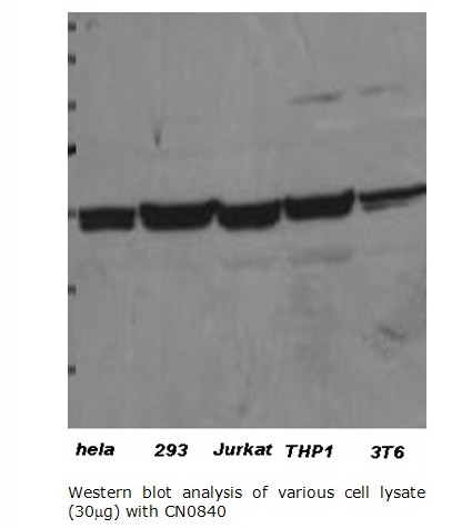 Western blot analysis of 293 cell lysate 10 μg (left) and 30 μg (right) with CN0840.