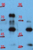 Western blot analysis of the 79 kDa PKC theta HeLa cell lysates (left); the 79kDa signal could be completely inhibited by the presence of 10 μg/mL of the antigen peptide (right) while the IgG signal remained.