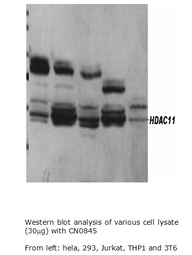 CN0845 The affinity purified rabbit polyclonal anti-HDAC10 antibody is developed using the C-terminal peptide of human histone deacetylase 10. It could be used for detection and isolation of HDAC-10. |