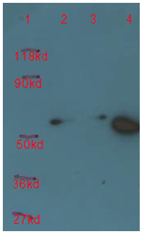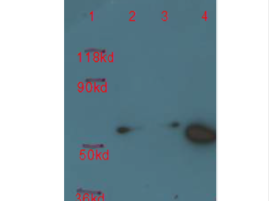 The His-tag protein (50 kDa) expressed cell lysate and affinity enriched by IP with His-tag antibody agarose (ICP1310) followed by WB analysis with His-tag antibody HRP conjugates (ICP0851)