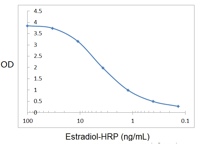 Direct ELISA titration of Estradiol-HRP (CN1056) using immobilized anti-Estradiol (3 μg/mL), OD50 titer for CN1056 is approximately 5 ng/mL.