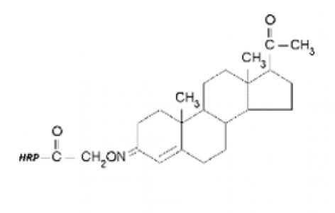 Direct competitive inhibition ELISA using immobilized anti-progesterone (3 μg/mL), and progesterone-labelled HRP (100 ng/mL). 50% inhibition occurred at 5 ng/mL of free progesterone under non-optimized conditions.