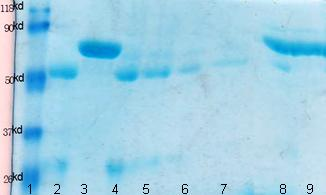 SDS Profile: MW markers (1); Human IgG Std (2); Human serum albumin Std (3); Elution fraction 1-5 (3, 4, 5, 6, 7); Original human serum (8) and human serum flow through (9).